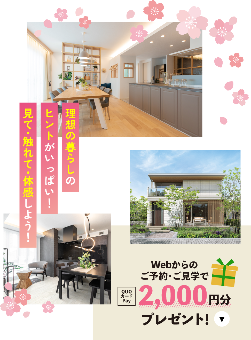 ※1. 「ステージ1」で分譲住宅にご来場の方は、ステージ2・ステージ3で分譲住宅見学をお選びいただいても対象外となります。※2. 対象は①資金・間取り相談、②敷地調査、③体感型ショールーム見学、④分譲住宅見学となります。これらの内1つ実施で4000円、最大で2つ実施で8000円分を後日Eメールにてプレゼント致します。ステージ2・ステージ3につきましてはホームページからのご予約は対象外となります。ご予約方法は営業担当にお尋ねください。※3 体感型ショールーム見学はセキスイハイムミュージアム・ハイムギャラリーパークからお選びいただけます。