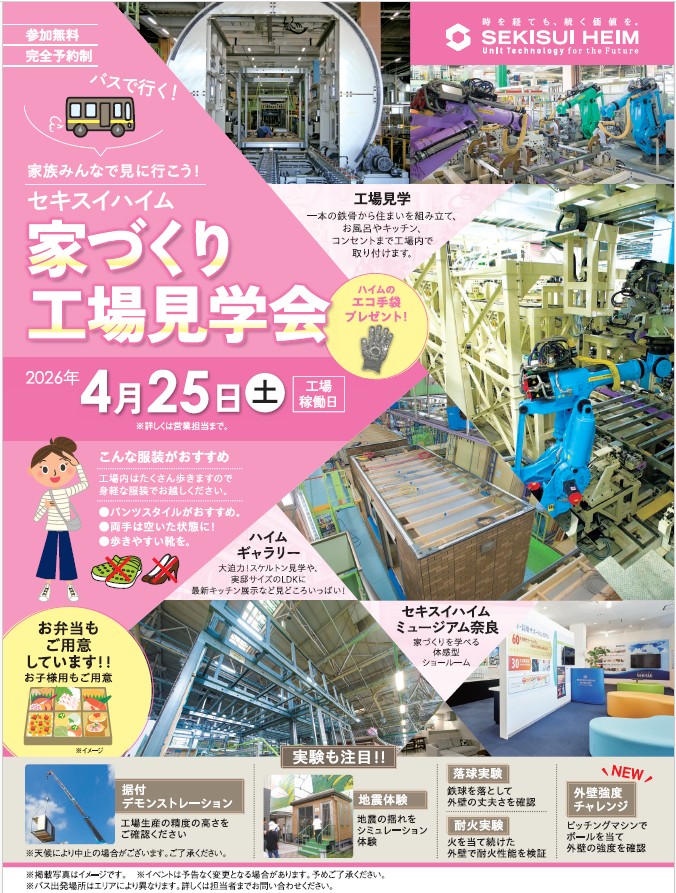 - 近畿セキスイハイム工業 ※滋賀県内からバスにご乗車いただき現地へ(出発地はお問い合わせください) ※事前予約が必要です