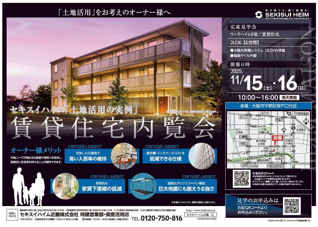 セキスイハイム「土地活用の実例」 賃貸住宅内覧会 を開催いたします。
