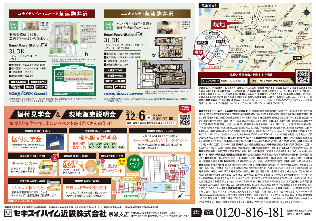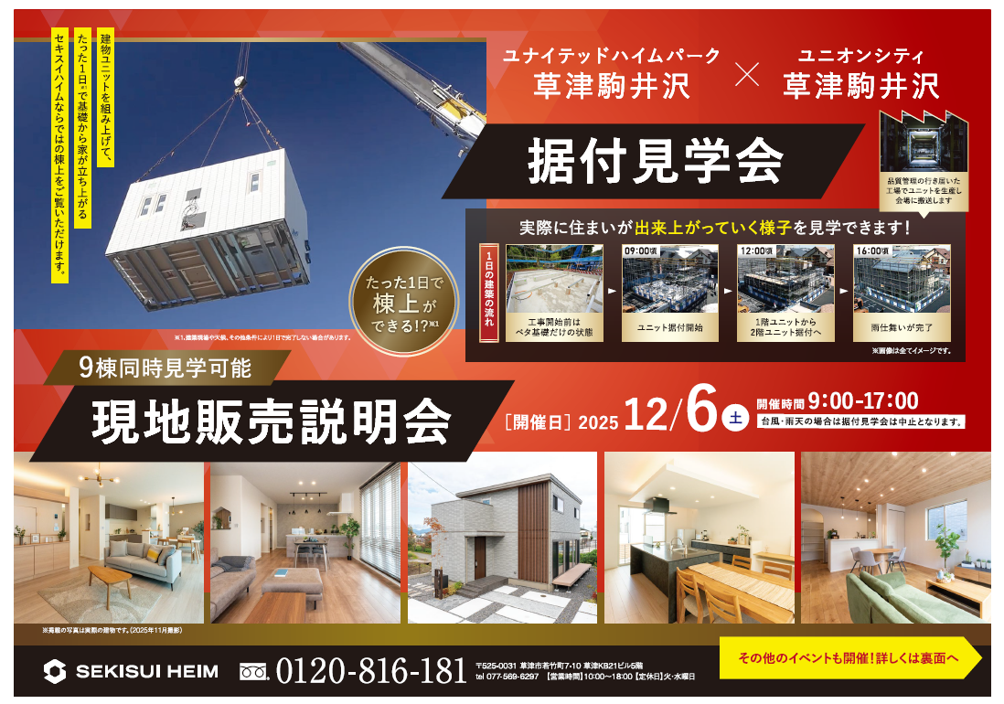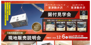 12/6(土)9:00~17:00現地販売説明会開催中です。※台風・雨天の場合は据付見学会は中止となります。
