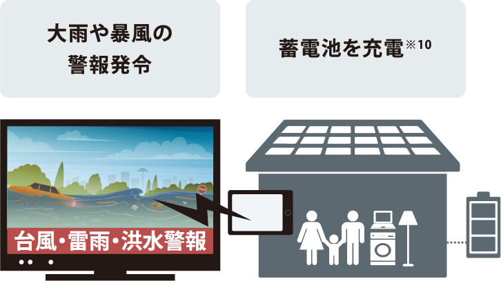 大雨などの警報が発令された際には停電に備えて自動で蓄電池への充電を開始。※10