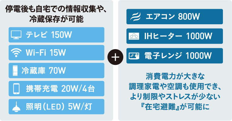 停電時には、貯めた電力で、冷蔵庫やスマートフォンの充電、