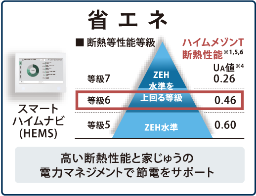1住戸あたり約2.5kWの太陽光発電、蓄電池、スマートハイムナビ(HEMS)、断熱等性能等級6※1 の断熱性能が標準搭載※2。