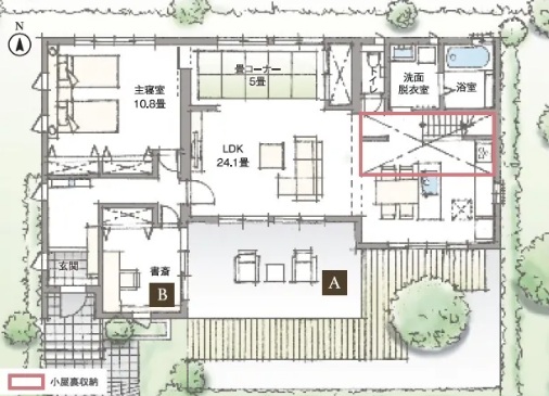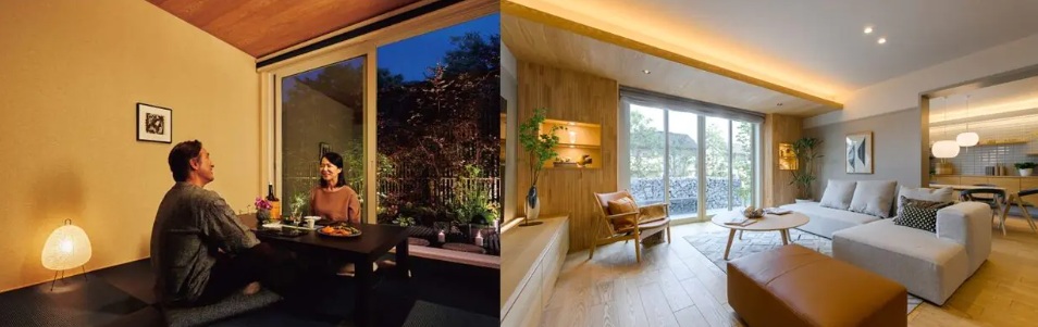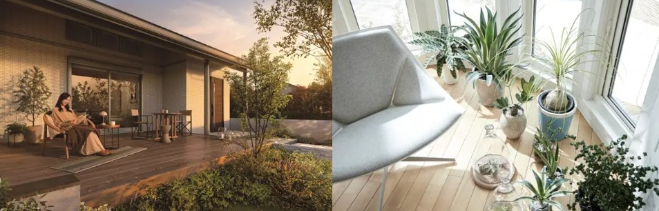 【A】空と自然に囲まれるテラスで読書やお茶を愉しむ、開放的な暮らしを叶えます。【B】縁側とつながる書斎で、景色を楽しみながら自分だけの世界に浸る優雅なひとときを。