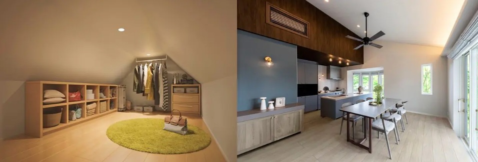 【A】庭に面した大開口から、たっぷりと陽が降り注ぐ明るく開放的なリビングダイニング。【B】小屋裏収納はお気に入りの服を飾って。何を着るかわくわくしながら選べます。