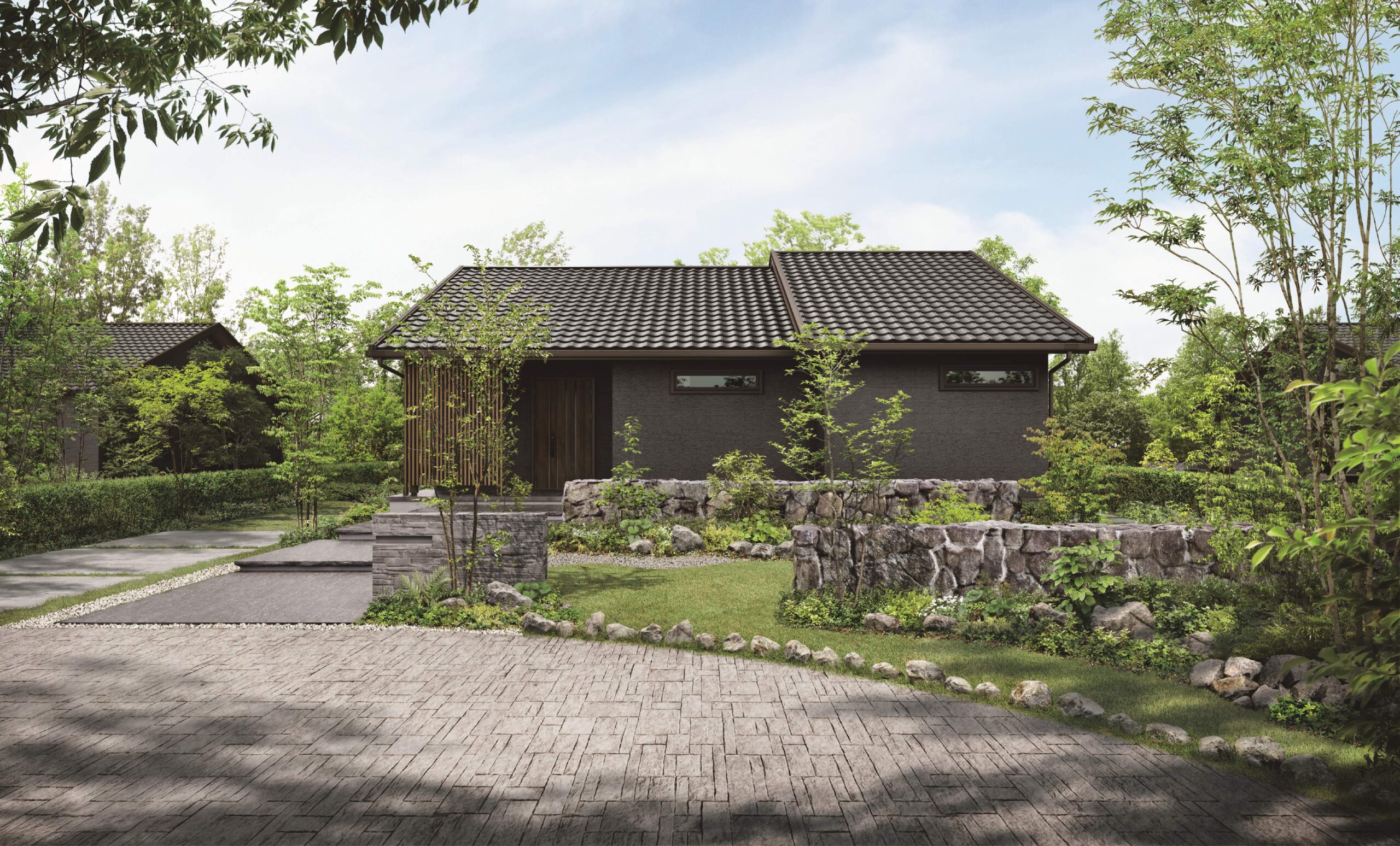 シンプルモダンな外観とダークトーンの外壁や瓦が織り成す上質で落ち着いた佇まい。