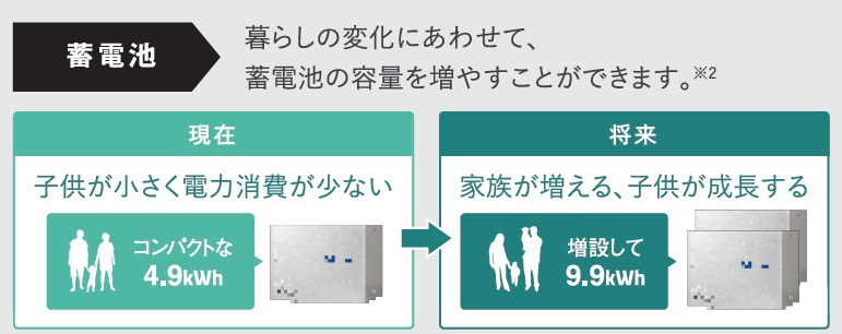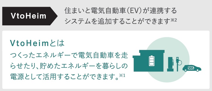 ※1 停電時において、電気自動車の電池容量が放電下限値(車種により異なる)またはセキスイハイムが販売するVtoHシステムに設定されている放電下限値のいずれかを下回る場合、宅内に電気を供給すること(放電)や、夜間(太陽光発電システムで発電できない時間帯)EVに充電することができなくなります。また、電力が使える範囲は事前の設計により異なります。同時に使える電力には限りがあります。※2 増設設置期限は2031年12月までです。設置場所により増設できない場合があります。詳しくは営業担当へご確認ください。