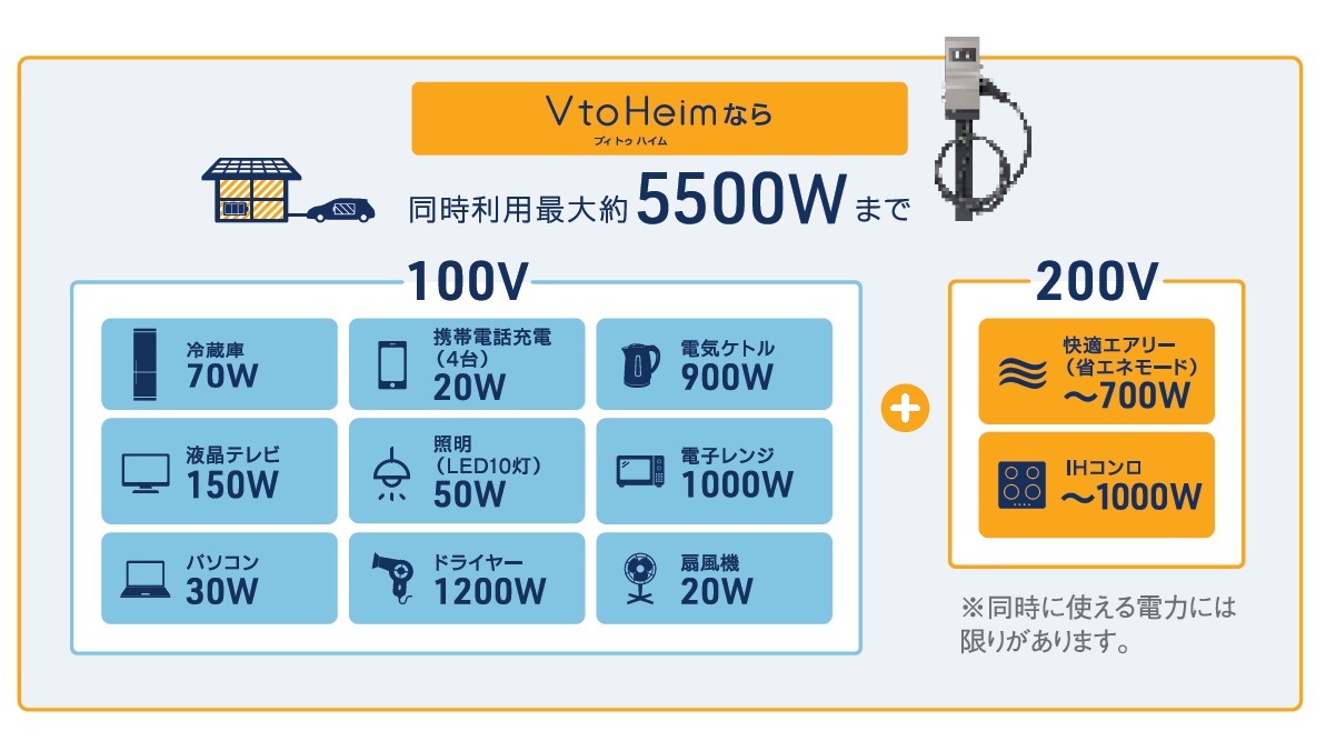 ※1 停電時において、電気自動車の電池容量が放電下限値(車種により異なる)またはセキスイハイムが販売するVtoHシステムに設定されている放電下限値のいずれかを下回る場合、宅内に電気を供給すること(放電)や、夜間(太陽光発電システムで発電できない時間帯)EVに充電することができなくなります。また、電力が使える範囲は家まるごと仕様で別途分電盤を追加した部分を除きます。同時に使える電力には限りがあります。