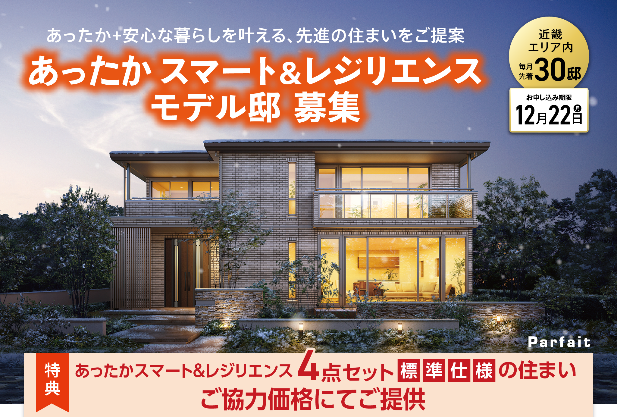【募集について】●今回募集する「あったかスマート&レジリエンスモデル邸」は期間内毎月先着30邸です。お申込み期限は2025年12月22日(月)まで。ご成約邸数に達し次第、受付を終了させていただきます。※それぞれ他のキャンペーン特典との併用はできません。※詳しくは営業担当にお尋ねください。