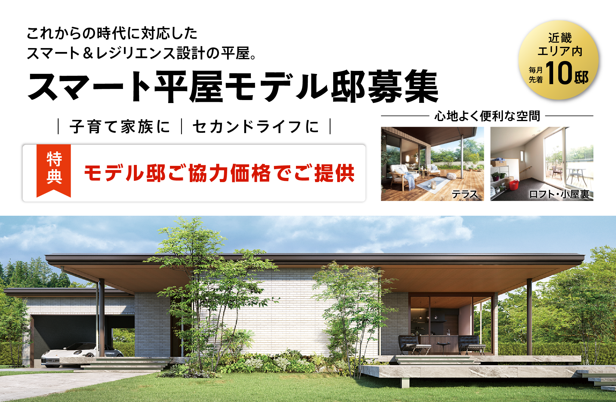 【募集について】●今回募集する「スマート平屋モデル邸」は毎月先着10邸です。ご成約邸数に達し次第、受付を終了させていただきます。※それぞれ他のキャンペーン特典との併用はできません。※詳しくは営業担当にお尋ねください。