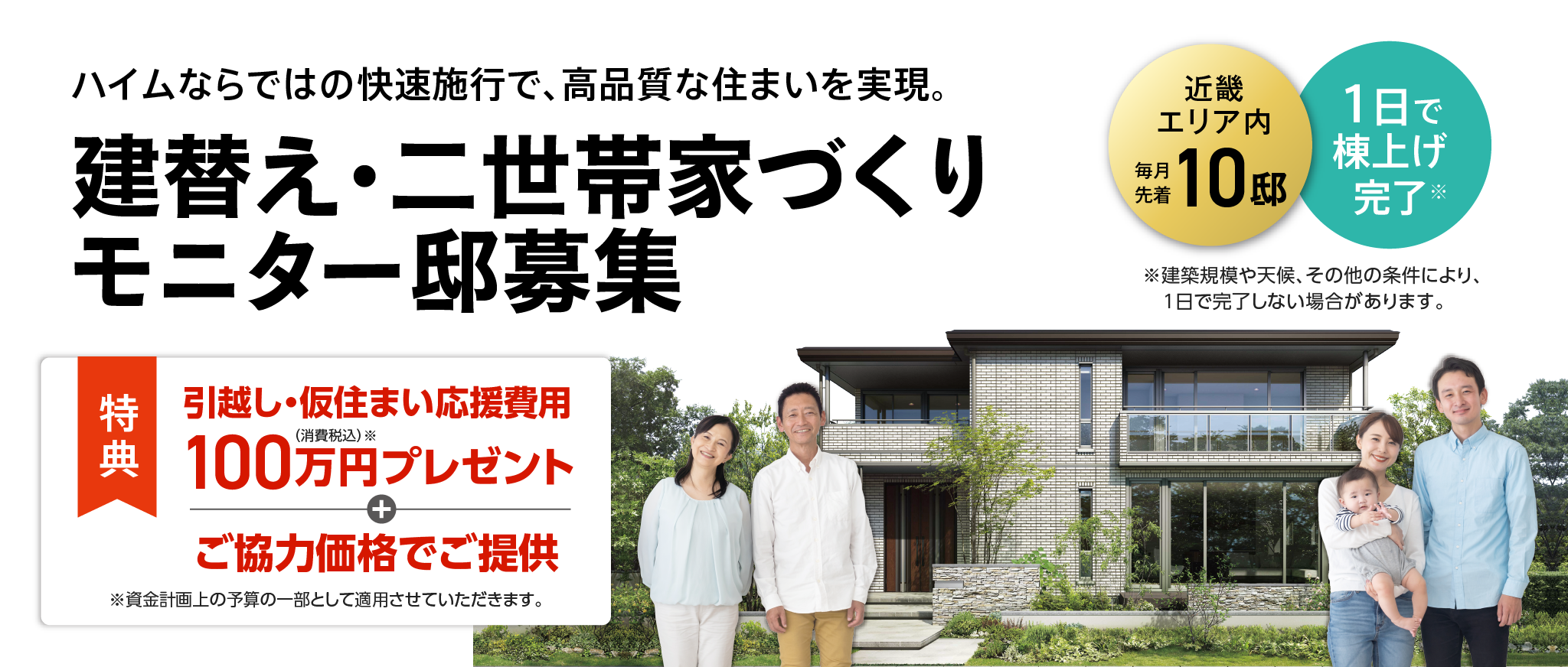 【募集について】●今回募集する「建替え・二世帯家づくりモニター邸」は毎月先着10邸です。ご成約邸数に達し次第、受付を終了させていただきます。※それぞれ他のキャンペーン特典との併用はできません。※詳しくは営業担当にお尋ねください。